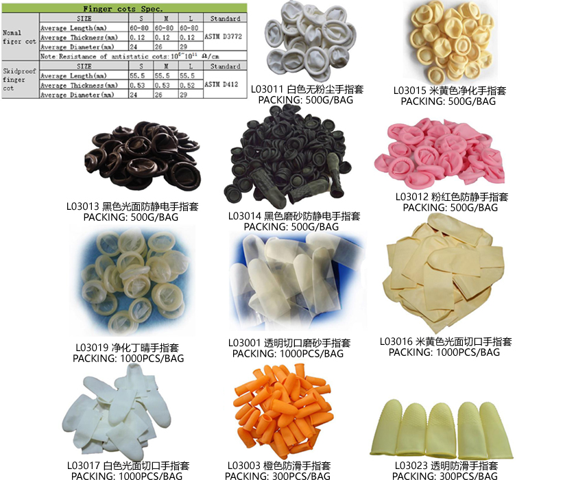 L03013 | 一样光面防靜電指头套 | S,M,L | Yes | 10000 | PCB开发,光学五金电器塑胶制品车间管理 | 500g/bag |