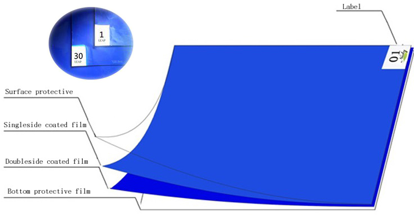 PE粘尘垫常规有32层, 第1层是无胶PE白色膜,2~30层为涂胶PE膜,底层为涂胶双面PE膜。